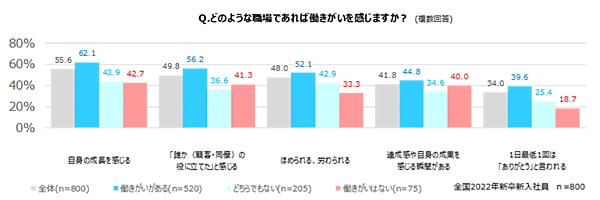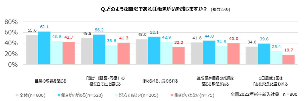一方「今の職場は働き甲斐があるといえるか」と聞くと、「働きがいがある」は65.0%と比較的多い。「どういう職場に働き甲斐を感じるのか」という質問には、全体の回答では「自身の成長を感じる」55.6%が最多で、「誰かの役に立てたと感じる」49.8%、「ほめられる、ねぎらわれる」48.0%が続く。