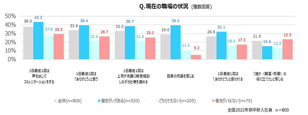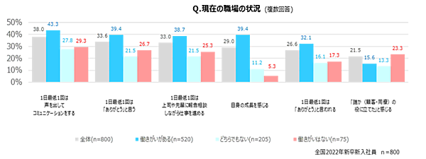 しかし「現在の職場状況」を聞くと、「自身の成長を感じる」29.0%、「誰かの役に立てたと感じる」21.5%は総じて低く、理想とのギャップを感じさせる結果となっている。