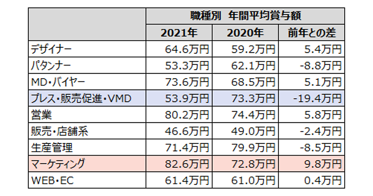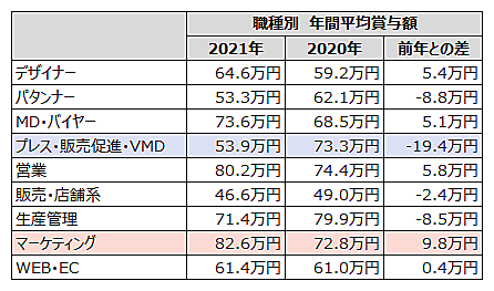 こうした背景は職種別の平均年間賞与額にも現れており、EC事業拡大のため「マーケティング」ニーズが急増したことで、マーケティング職の賞与額が約10万円増加した。一方で「プレス・販売促進・VMD」の平均年間賞与はマイナス19.4万円と大きく減少している。これは前年2020年に、経験豊富な即戦力人材の登録が増加した反動で、2021年は経験が浅い若手層の登録が増加。これにより、同職の給与水準が下がったと推察される。