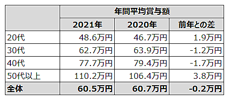 2021年1月~12月に「クリーデンス」に登録した人の平均年間賞与額は「60.5万円」で、前年からわずかに減少したが、ほぼ同水準を保っている。年代別でみると、20代の若手層、50代以上のベテラン層の賞与額が増加し、30代・40代は減少している。