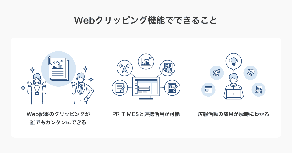PR TIMESの企業向け管理画面で利用するWebクリッピングは、大手ニュースサイトから新興Webメディア、キュレーションメディア、動画メディアまで2300以上のWebサイトに日々掲載される記事の中から、指定キーワードを含む記事を調査・抽出し、分析可能な形でレポートする。1日約10万件~15万件、最大20万件の記事を調査し、広報活動の成果チェックや自社に関する報道状況、競合他社や業界動向の報道調査に利用できる。