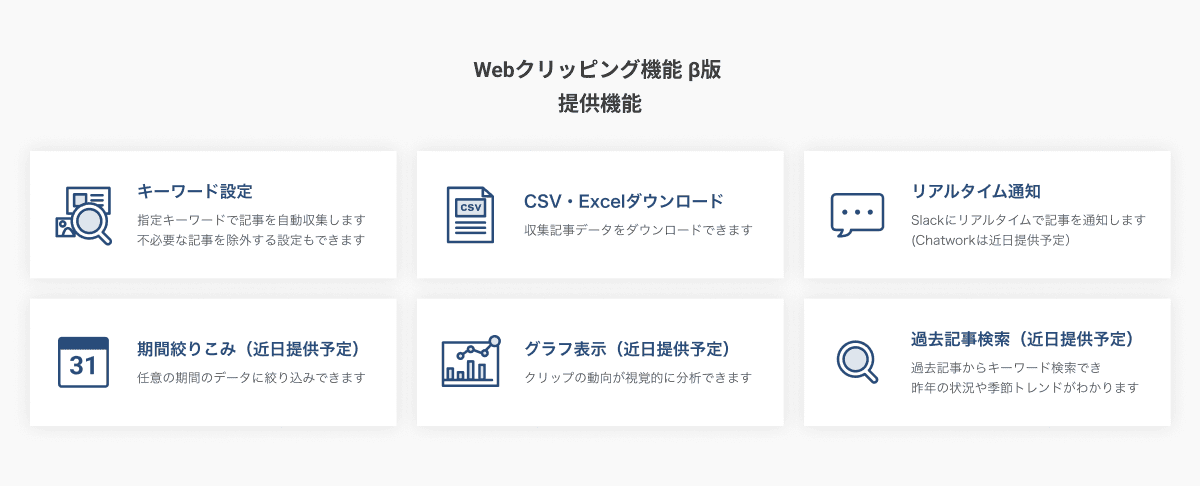 管理画面と同一ページで効果測定が可能になり、自社に関する報道を元に成果を振り返り、今後の広報活動のヒントにできる。従来のWebクリッピングからUI(ユーザーインターフェース)を一新して、クリップ詳細ページでは各掲載数やグラフを大きく見やすくした。調査した記事は、ビジネスチャットツールの「Slack」や「Chatwork」へ即時通知する。リアルタイムで確認できるのでタイムリーな社内共有が可能だ。
