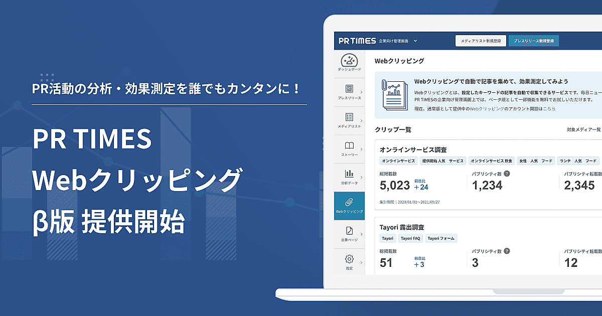 プレスリリース配信サービス「PR TIMES(ピーアールタイムズ)」を運営するPR TIMESは、広報活動や自社に関する報道の調査・分析に役立つ「PR TIMES Webクリッピングβ版」の提供を始める、と8月24日に発表した。2017年1月から提供する広報効果測定サービス「Webクリッピング」の一部機能をPR TIMESの管理画面内で提供する。PR TIMESを利用中の企業は追加料金なしで使え、23年2月以降に正式版として有料提供する。
