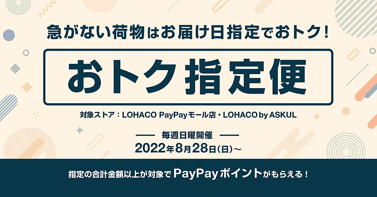 ヤフーと、通信販売事業のアスクルは、運営する一般消費者向け日用品ショッピングサイト「LOHACO」で標準より遅い配達日を指定すると。QRコード決済「PayPay」のポイントサービス「PayPayポイント」を提供する「おトク指定便」の実証実験を8月28日から始める、と8月24日発表した。注文が集中する毎週日曜日で、8月28日から10月9日の各日曜日で計7日間の注文で行う。