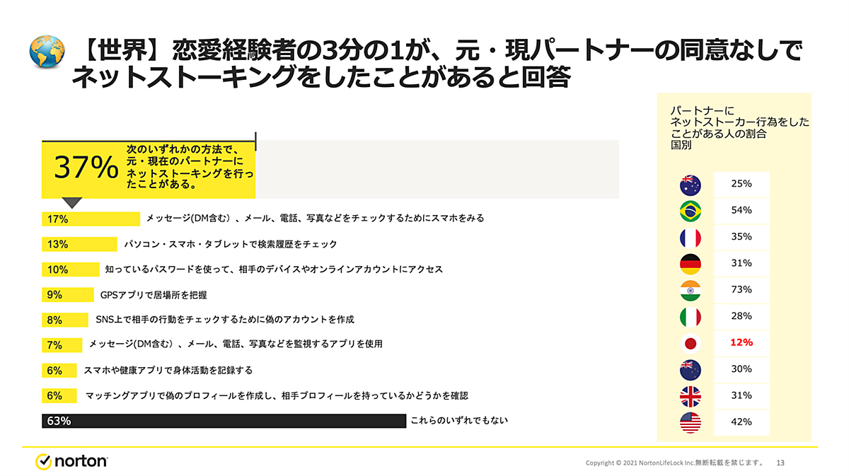 これらネットストーキングを行ったことがあるという人に「ストーキングのもっとも多かった手段」を聞くと、世界10か国全体では「現・元パートナーのスマホを見て、メッセージ(メールやDMを含む)、電話履歴、写真を確認」17%が最多で、「現・元パートナーのパソコン・スマホ・タブレットなどで検索履歴を確認」13%、「知っているパスワードを使って、相手のデバイスやオンラインアカウントにアクセス」10%が上位だった。“相手の行動を追跡する”というより、“覗き見”や“監視”といったありふれたものが多い印象だが、これらもネットストーキングに当たると考えられる。