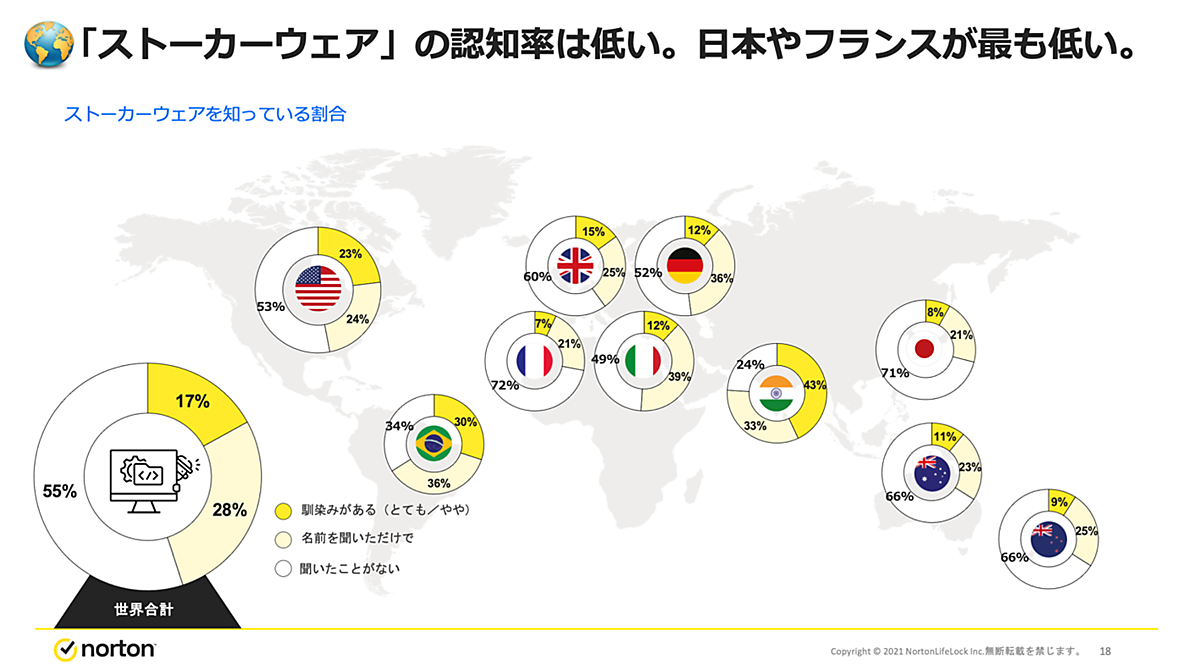 ノートンライフロックは、「ネットストーキング」に関する調査結果を発表した。パソコン・スマホを通した監視・ネットストーキング、ストーカーウェア(ストーカー行為に利用可能なアプリ)について、日本1,000人を含む、10か国・1万人以上の消費者を対象にアンケートを行っている。
