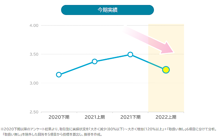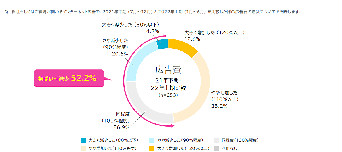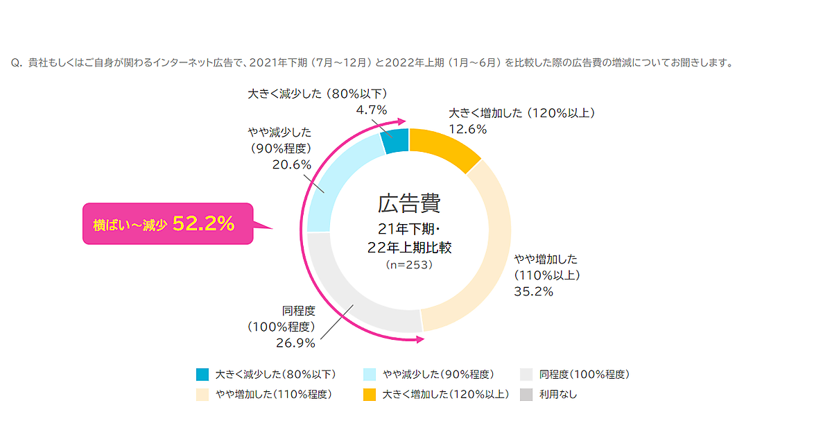 まず2022年上期のインターネット広告費について聞くと「大きく増加した」12.6%、「やや増加した」35.2%に対して、「同程度」26.9%、「やや減少した」20.6%、「大きく減少した」4.7%となり、活況な企業がありつつも、「横ばい~減少した」との回答が半数を超え52.2%を占めた。インターネット広告費の実績は2020年下期以降、上昇を続けていたが、2022年上期は初めて下降を見せた。