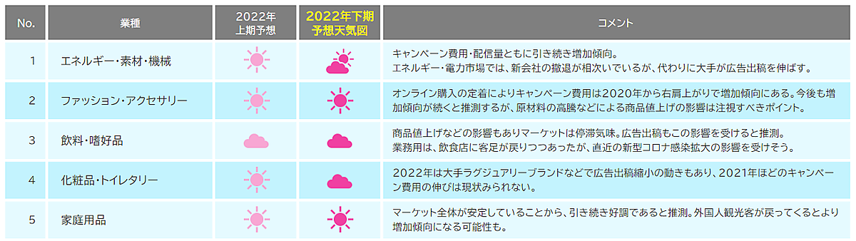 2022年下期における出稿予測を業種別に見ると、「エネルギー・素材・機械」の出稿増加が特に期待されている。その他「ファッション・アクセサリー」「飲料・嗜好品」などが、現在の停滞からの復調により、出稿を伸ばすと見られる。