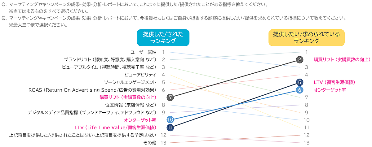 これを「現在顧客に提供している広告指標」とのランキングの差異で見ると、「購買リフト」は提供している指標7位だが今後提供したい指標では2位まで上昇する。同様に、「LTV(顧客生涯価値)」は11位→5位、「オンターゲット率」は10位→6位と、今後の注力分野であることがうかがえる。