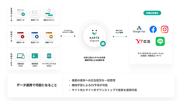 KARTE Signalsは、広告媒体との連携でCXを実現するソリューション。サードパーティーCookie(クッキー)の規制が本格化する中、ファーストパーティデータを利用。オンライン広告でのファーストパーティデータ活用に加え、CRM(顧客関係管理)の購買データや実店舗のPOS(販売時点情報管理)データも統合し、顧客とのコミュニケーションに生かせる。