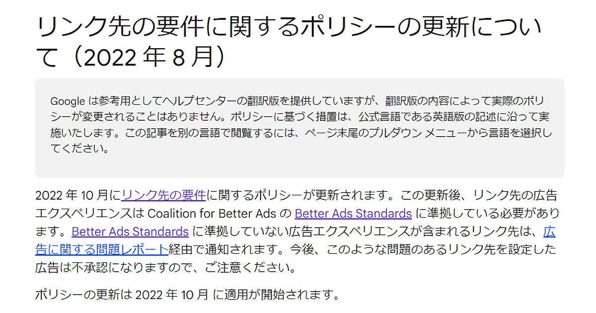 Google広告のポリシー変更に伴い、Better Ads Standardsに準拠していない広告エクスペリエンスを含むリンク先は、Googleから「広告に関する問題レポート」経由で通知される。通知された場合は修正、削除する必要がある。Googleは、こうした問題のあるリンク先を設定している広告は今後不承認になる、と注意を促している。