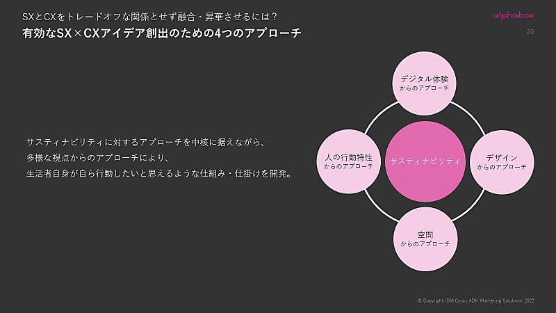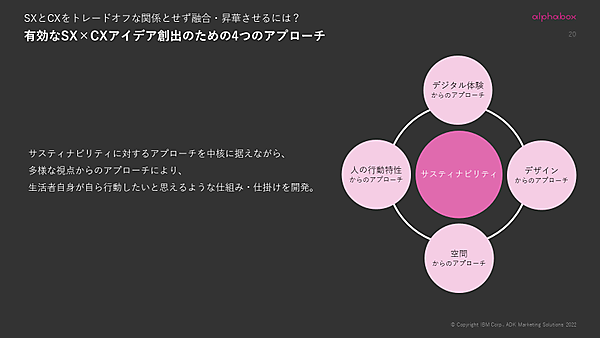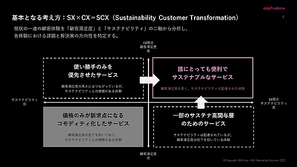ADK MSと日本IBの共同事業となるCXコンサルティング・ユニット「alphabox」で展開する。サステナビリティへの取り組みが企業にとって欠かせなくなる一方、サステナブルな事業への転換(SX)とCXは異なる方向を向いているため、サステナビリティ活動の導入をためらう企業も多い。SX面で理想的でも、CXの視点からは生活者が望む体験になっていないことが要因。