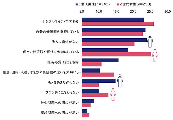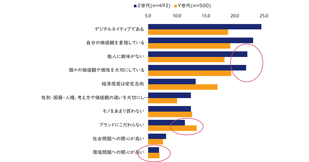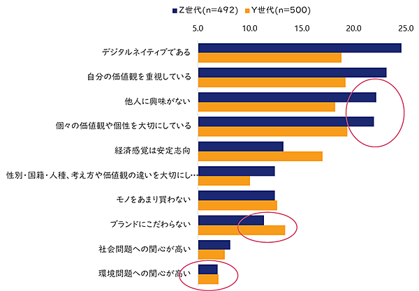 Y世代に比べてZ世代が低かったのは「経済感覚は安定志向」「モノをあまり買わない」「ブランドにこだわらない」「環境問題への関心が高い」などだった。