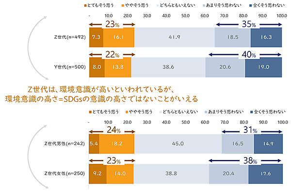 また「Z世代は『SDGs』への関心が高いといわれていることについてどのように感じますか?」と聞くと、Z世代自身、Y世代から見たZ世代それぞれで大きな差はない。また『SDGs』への関心が高いかについては「とても思う+やや思う」が2割前後であるのに比べ、「あまり思わない+まったく思わない」は4割近くとなっている。