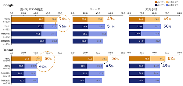 なお「検索エンジンの利用状況」をZ世代とY世代で比較すると、Google検索の利用はほぼ両世代で差はみられず、Z世代もSNS検索だけでなくGoogle検索を利用していることがわかる。ただしYahoo!検索については、Y世代の50%に対しZ世代は42%と下がり“ヤフー離れ”が見てとれる。