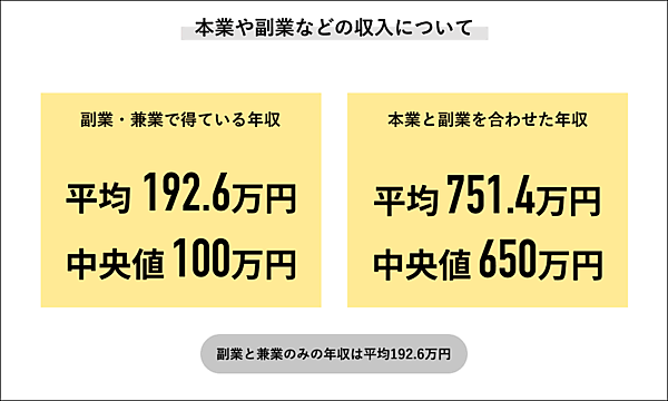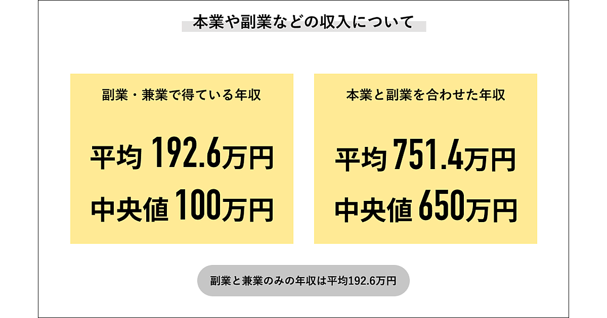 また「副業・兼業の年収」については、「平均192.6万円」「中央値100万円」だった。最高値は「1,655万円」、最低値は「1万円」だったという。「本業と合算した年収」は、「平均751.4万円」「中央値650万円」だった。