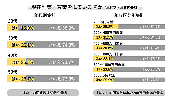 まず「現在副業をしているか」を聞くと、副業・兼業の実施率は全体では21.6%。年代では50代の26.7%が最多で、20代の15.0%が最少だった。本業だけの年収区分で見ると「200万円未満」35.3%が最多となったが、「1,000万円以上」25.9%もそれに続く。生活費の足しといった考えがある一方、手元の資金を使ってサイドビジネスに手を出すというように、二極化が考えられる。