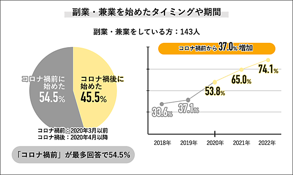 また「副業・兼業を始めたタイミング」については、「コロナ禍の前」54.5%が「コロナ禍の後」45.5%を上回った(コロナ禍は2020年4月で区分)。ただし、コロナ禍前の2019年までは37.1%に対し、コロナ禍に入った2020年から急増しており、2022年は74.1%と急増している。これは近年、政府による副業推進が鮮明になった影響も大きいと考えられる。