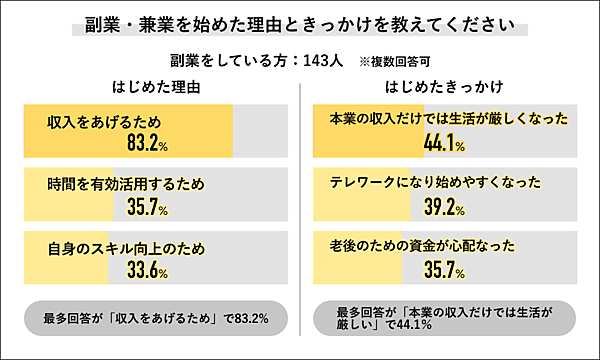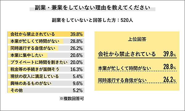 「副業・兼業をしている」143人および「副業・兼業をしていない」520人それぞれに、「副業・兼業を始めた理由・きっかけ」「副業・兼業をしていない理由」を聞いた。その結果、始めた理由では「収入を上げるため」83.2%、「時間を有効活用するため」35.7%、「自身のスキルを向上させるため」33.6%が上位に、しない理由では、「会社から禁止されている」39.8%が特に多く、「本業が忙しくて時間がない」28.8%、「同時進行する自信がない」26.2%がそれに続いた。