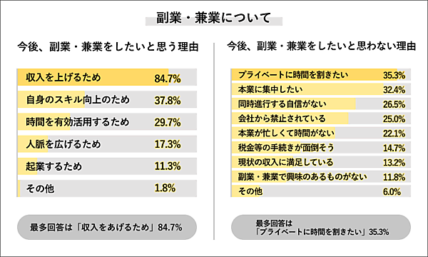 「今後副業をしたいか」と聞くと、「したいと思う+どちらかといえばしたいと思う」の合計は89.8%(595人)で圧倒的に多い。この人たちに理由を聞くと、「収入を上げるため」84.7%、「自身のスキルを向上させるため」37.8%、「時間を有効活用するため」29.7%で、現状すでに副業している人より収入増への期待が大きい。逆にしたくないとした人は「プライベートに時間を割きたいから」35.3%、「本業に集中したい」32.4%といった声が多かった。