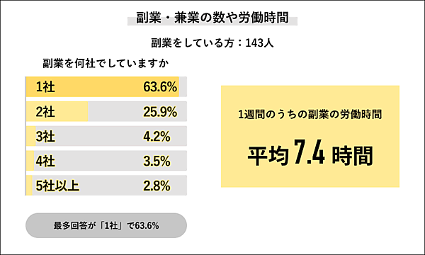実状を探るべく「副業・兼業をしている」143人に「本業以外で仕事をしている社数」を聞くと、「1社」63.6%が最多で、「2社」25.9%、「3社」4.2%が上位。「副業・兼業に割く労働時間」は「平均7.4時間」と判明した。