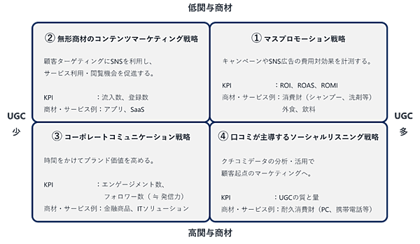 フレームワークは、企業とソーシャルメディアのよりよい関係を研究しているソーシャルメディア委員会の発案で制作された。企業SNSの運営では「商材の特性」と「UGC(SNS上のクチコミ)の量」がSNS運営の戦略を分けるとして、①マスプロモーション戦略、②無形商材のコンテンツマーケティング戦略、③コーポレートコミュニケーション戦略、④クチコミが主導するソーシャル・リスニング戦略――の4つの戦略類型を提示している。