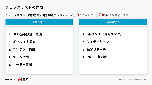 チェックリストは、①SEO施策設計・企画、②Webサイト構成、③コンテンツ構成、④ツール活用、⑤ユーザー体験、⑥被リンク、⑦サイテーション、⑧顧客リサーチ、⑨PR・広報活動――の9カテゴリに分かれており、全部で70項目以上のチェックポイントを設定した。それぞれ5~10個程度の項目で構成されており、自社のSEO状況やWebマーケティング状況を簡単にチェックすることができる。