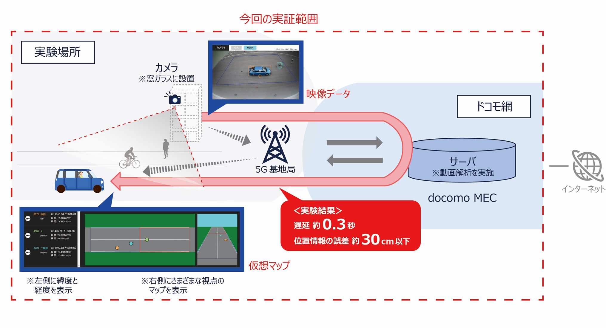 NTTドコモと、ガラス世界大手のAGC、ドコモ傘下のNTTコミュニケーションズ(NTT Com)は、トヨタ自動車と共同で車や人の位置をリアルタイムで仮想空間のマップに表示する国内初の実証実験の成功を確認した、と9月8日に発表した。建物などのインフラから車や自転車、人などの移動する物体(移動体)の位置情報をリアルタイムで正確に把握し、走行している車中の仮想マップで死角から車に近づく自転車や人を確認した。