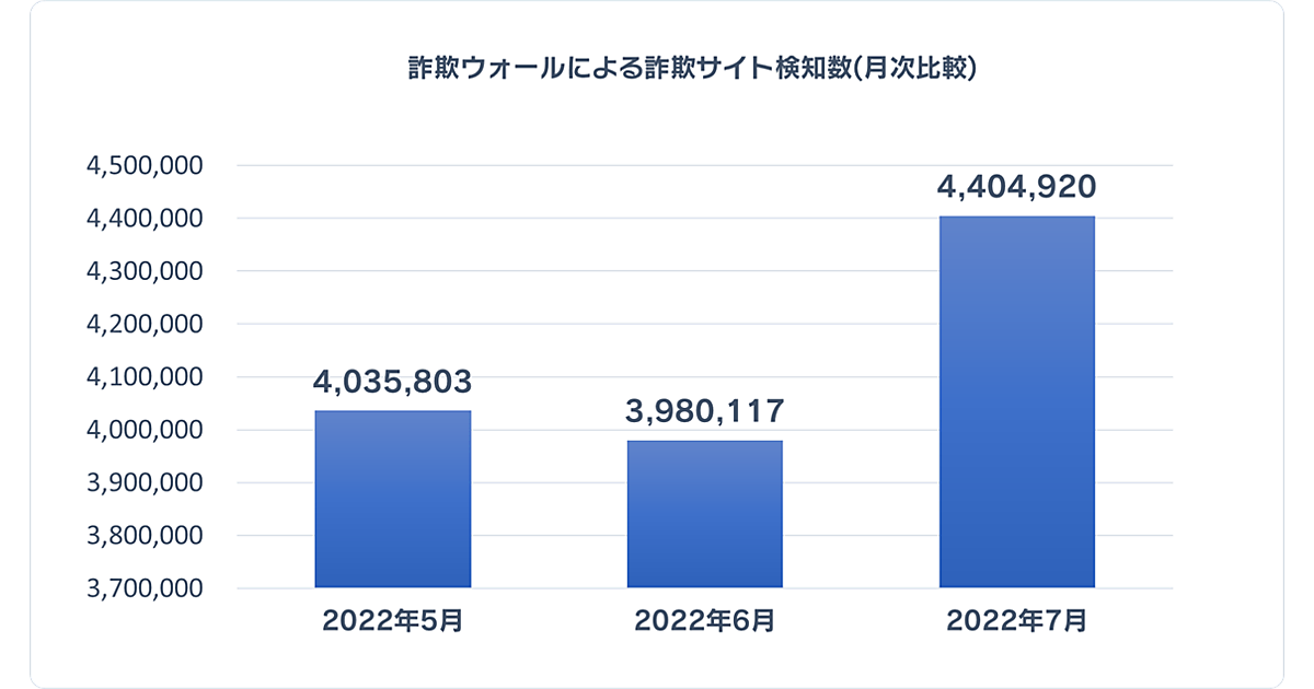 まず2022年7月における「詐欺ウォール」の詐欺サイト検知数は440万4,920件で、2022年6月から42万4,803件増加した。