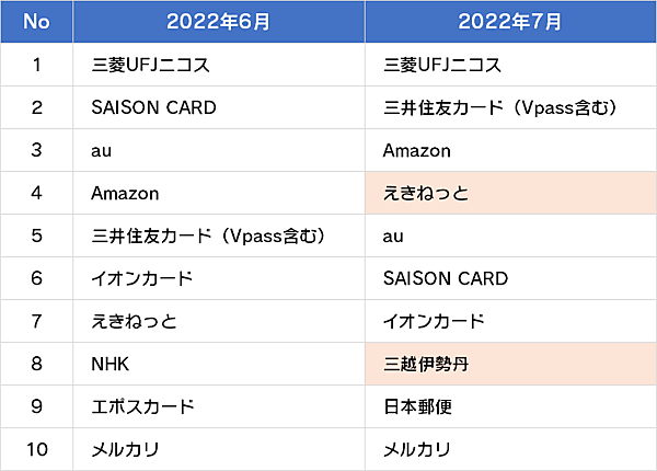 傾向としては、引き続きクレジットカードを狙ったフィッシング詐欺が多いが、7月度は三越伊勢丹ショッピングサイトのログイン情報を盗むフィッシング詐欺サイトが急増し、6月の圏外から8位にランクアップしていた。一般的なECサイトより、三越伊勢丹ショッピングは利用者の年齢が高く、そうした高齢層を標的にした可能性が考えられる。