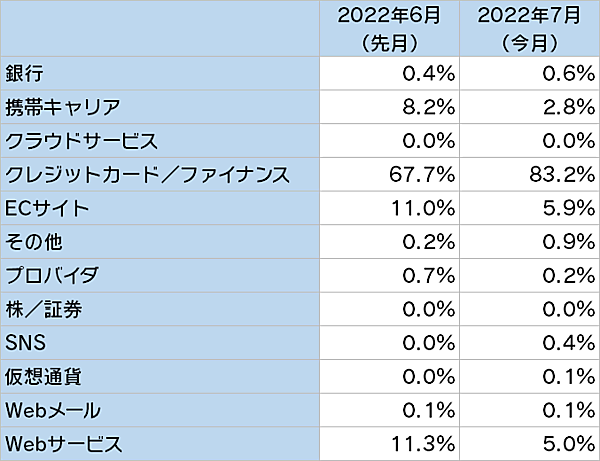 フィッシング詐欺サイトをカテゴリ別に見ると、「クレジットカード/ファイナンス」情報を狙う詐欺サイトの割合が増加しており、過去最高の83.2%を記録している。この他にも、「Yahoo!サービス」のログイン情報を盗む詐欺サイト、そして「えきねっと」の詐欺サイトも増加しているという。こちらも夏の行楽時期に合わせて、標的を絞っていることが考えられる。