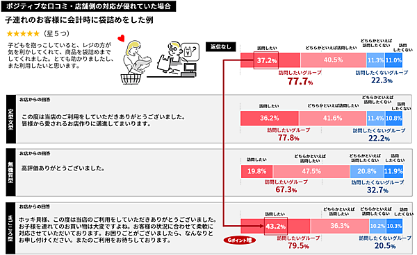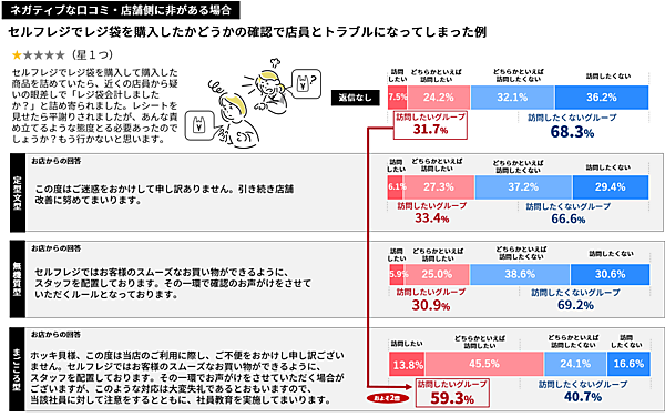 これらの組み合わせを踏まえ「この店舗に訪問したいか?」を聞くと、まず「(1)ネガティブなクチコミ」においては、「返信なし型」に68.3%が「店舗を訪問したくない」と回答した。また「定型文型」「無機質型」もあまり大きな変化はなく、ただ回答するだけでは印象が変化しないことがわかる。一方で、「まごころ型」の返信は、「訪問したくない」が40.7%にとどまった。
