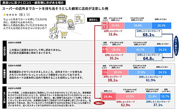 そこで、クチコミについて「(1)ネガティブなクチコミ」(例:セルフレジでレジ袋を購入したのか疑われた)、「(2)勘違いに基づくクチコミ」(例:店舗の外までカートを持ち出した客が、店員さんから注意された)、「(3)ポジティブなクチコミ」(例:レジでの対応がすばらしかった)の3タイプに分類するとともに、その返信を以下の4パターンに集約した。