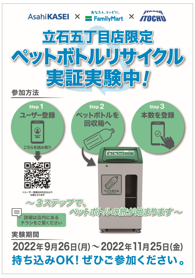 旭化成、ファミリーマート、伊藤忠商事、同社の100%子会社で包装材料の販売などを手掛ける伊藤忠プラスチックスの4社は、使用済みのペット(PET)ボトルがリサイクルされる過程がスマートフォンでトレース(追跡)できるサービスの実証実験を9月26日に始める、と9月12日発表した。東京都葛飾区の「ファミリーマート立石五丁目店」に回収箱を置いて11月25日まで行う。