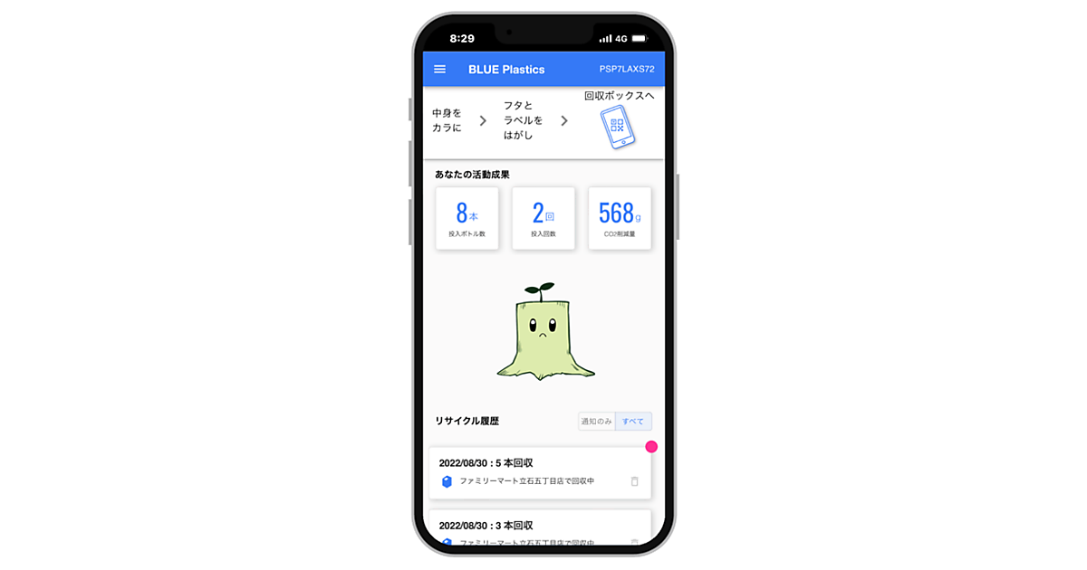 同店の店頭(屋外)に設置した専用回収箱にペットボトルを投入する際、回収箱に記載された二次元コードをスマートフォンで読み取り、投入ボトルの本数をアプリに登録すると、投入した日時ごとにボトルが現在どの段階のリサイクルプロセスにあるか分かる仕組み。投入日時から回収・輸送状況、工場でペットボトルが粒状のペレットに加工されるまでアプリで確認できる。