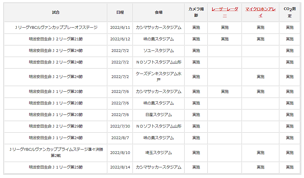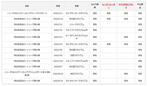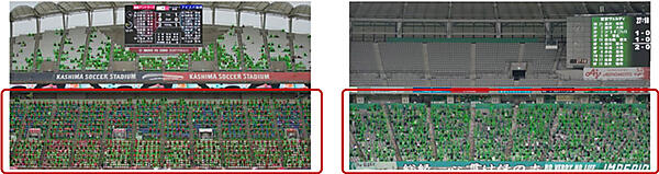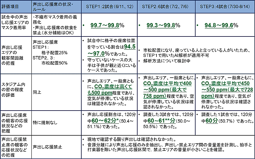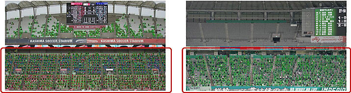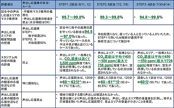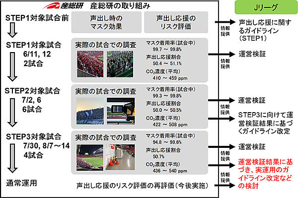 主要イベントにおける声出し応援は原則禁止だが、6月10日にJリーグでは「声出し応援に関するガイドライン」を発行、段階的導入を進めている。このガイドラインを踏まえ、「STEP1:6月11日・12日に開催された2試合(声出し応援エリア:収容率25%)」、「STEP1:7月2日・6日に開催された6試合(声出し応援エリア:収容率50%)」、さらにガイドラインを改定した「STEP3:7月30日・8月7日・10日・14日に開催された4試合(声出し応援エリア:収容率50%)」について、産総研ではカメラ撮影・AIを用いた調査を実施した。