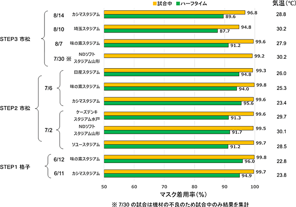 まず、声出し応援エリアの試合中のマスク着用率は94.8~99.8%で、「不織布マスクを着用して応援する」というルールは順守されていた。声出し応援再開前のマスク着用率(94.3%)をすべての会場で上回っていたという。また観客間距離もおおむね適切に守られていた。座席位置が守られていないケースの大半は、子どもが親と近くにいるケースだった。