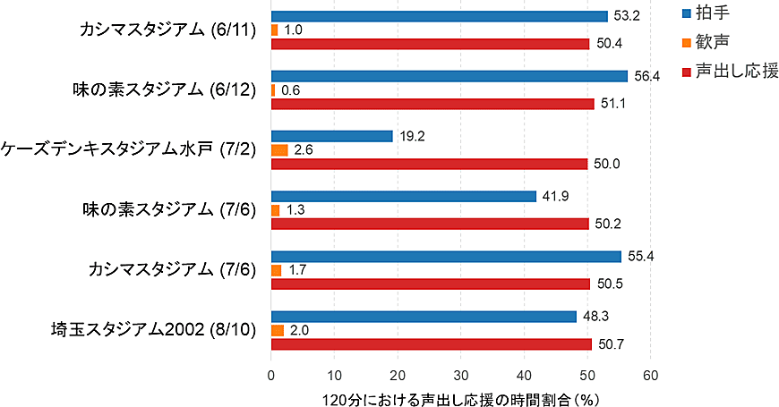なお声出し応援時間(ホーム側応援席)は、120分中60~62分で5割程度だった。また現地を視察する限りにおいて、声出し応援禁止席の観客が声出し応援をしている様子は確認されなかった。