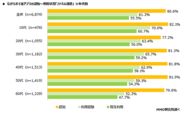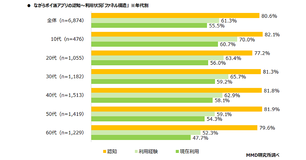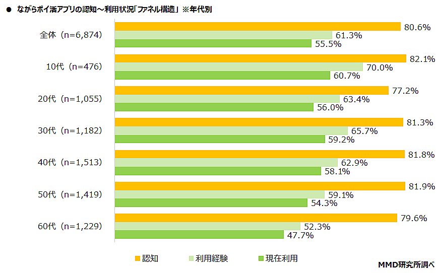 まず予備調査として7,248人に、スマートフォンまたはタブレットを利用しているかを聞くと6,874人が使用中。これらに「ながらポイ活アプリ」について聞くと、「認知」80.6%、「利用経験」61.3%、「現在利用」55.5%だった。比較的どの年代も「ながらポイ活アプリ」を知っているが、若年層ほど利用率は高い。