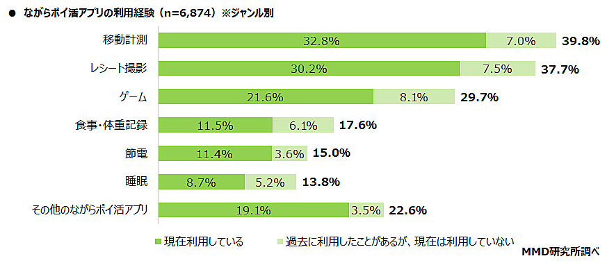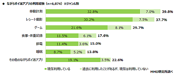 利用経験があるアプリのジャンルを聞くと、現在利用は「移動計測」32.8%、「レシート撮影」30.2%、「ゲーム」21.6%だった。過去利用は「ゲーム」8.1%、「レシート撮影」7.5%、「移動計測」7.0%が多く、「移動計測」の人気が根強いことがわかる。