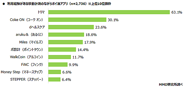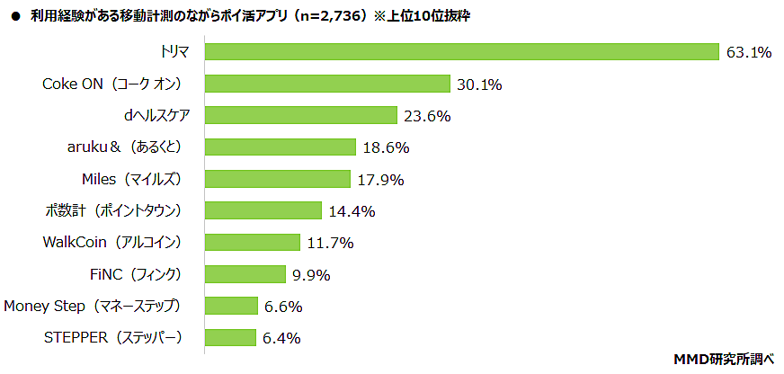 人気ジャンルである「移動計測」アプリについて、具体的なアプリ名を聞くと「トリマ」63.1%が圧倒的に多く、「Coke ON(コーク オン)」30.1%、「dヘルスケア」23.6%がそれに続いた。
