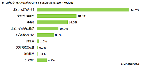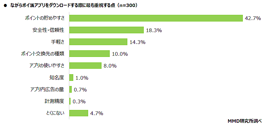 「ながらポイ活アプリを現在利用している」という300人を対象に、「意識してポイントを貯めているか」を聞くと、「意識している」は91.3%にのぼった。「ながらポイ活アプリをダウンロードする際にもっとも重視する点」では、「ポイントの貯めやすさ」42.7%、「安全性・信頼性」18.3%、「手軽さ」14.3%が上位だった。