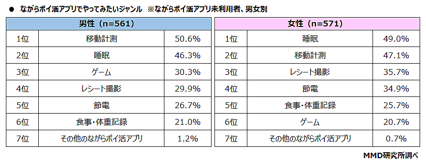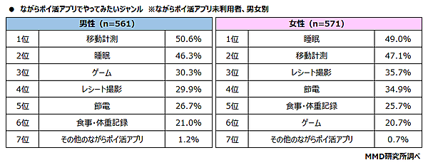 一方、ながらポイ活アプリ未利用者2,663人に、「ながらポイ活アプリでやってみたいジャンル」を聞くと、42.5%が「ある」と回答し、男性最多は「移動計測」50.6%、女性最多は「睡眠」49.0%だった。睡眠は男性でも2位に入っており、寝るだけでポイントを貯められるのが注目されているようだ。