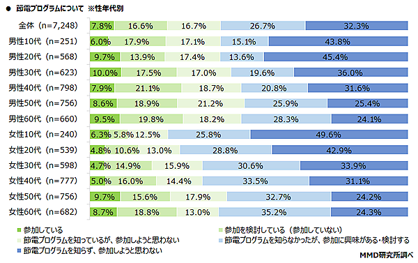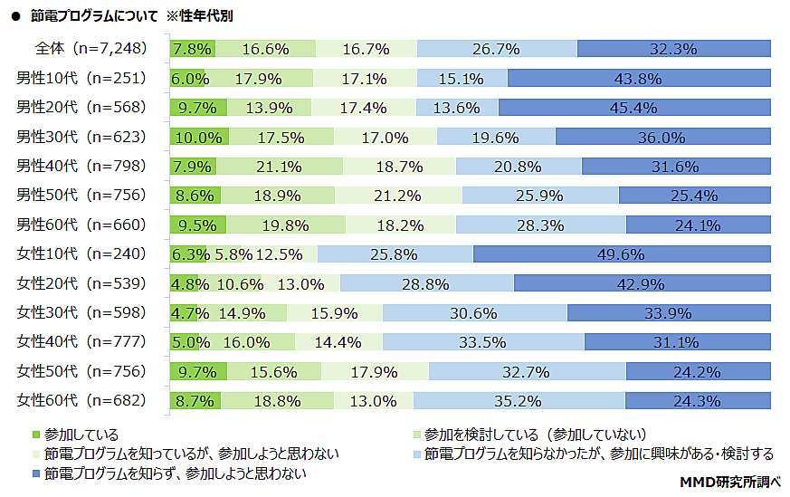 またこの夏に話題となった「節電に応じてポイントを付与する」プログラムについては、参加している人は1割以下。認知や今後の意向も、男性より女性が低調だった。