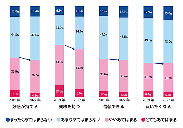 そこでNo.1表示広告への印象について、「興味を持つ」「好感が持てる」「信頼できる」「買いたくなる」という回答を、2019年の同調査と比較した。その結果、これらすべての項目で「あてはまる(とてもあてはまる+ややあてはまる)」という回答が減少したことがわかった。コロナ禍を経て消費者は、No.1表示広告に対してより慎重な姿勢に変化したと考えられる。