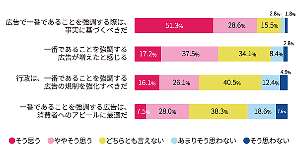 なお「No.1表示広告に対する考え方」を聞くと、「広告で一番であることを強調する際は、事実に基づくべきだ」とした人が79.9%(そう思う+ややそう思うの合計)に達した。また「一番であることを強調する広告が増えた」と感じている人も54.7%と多い一方、「消費者へのアピールに最適だ」と考える人は35.5%にとどまるなど、鵜呑みにする消費者は一部に限定され、その他の多数派には不快感を抱かれている可能性が高い。