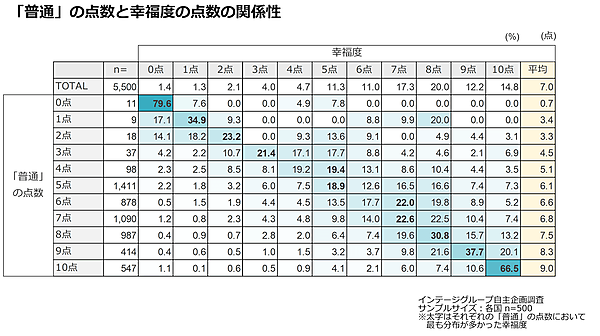 さらに同様に、「10点満点で『幸福度』は何点ですか」という質問を行った。すべての国について合算した結果、「普通」の点数と「幸福度」の点数は、分布がほぼ一致する傾向が見られた。これについてインテージでは「どの国の人も、自分の思う『普通』の点数を基準として『幸福度』も回答しているようにみえる」と指摘している。
