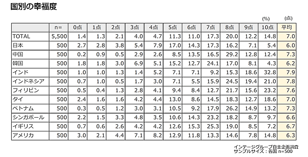 インテージは、「国際比較調査でみる10点法での評価スコアの国別傾向」として「幸福度」に関する調査結果を発表した。