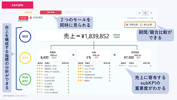 「マーケットビュー」機能は、楽天市場の商品カテゴリでTOP100の売上規模が分かり、指定した商品の売上を商品管理番号ごとに確認できる。「KPI(重要業績評価指標)ビュー」機能では、自社商品のブランドごとに売上を確認でき、期間や競合を設定して他社と売上を比較できる。ECモールの閲覧数やCVR(顧客転換率)、販売単価の分析も可能。