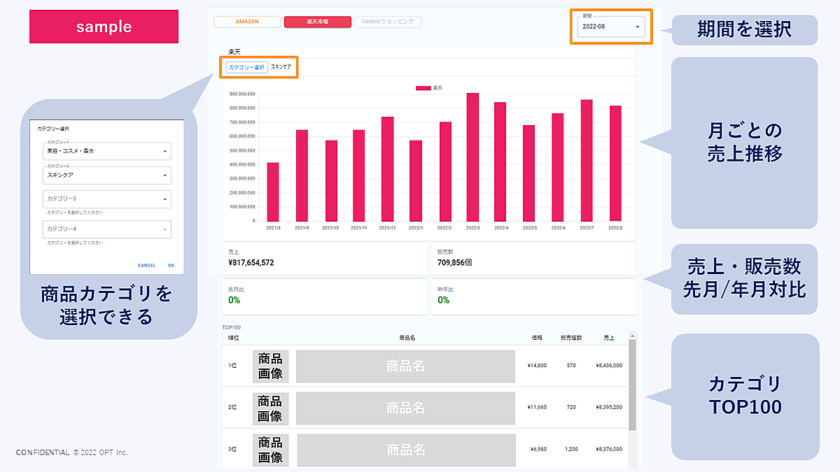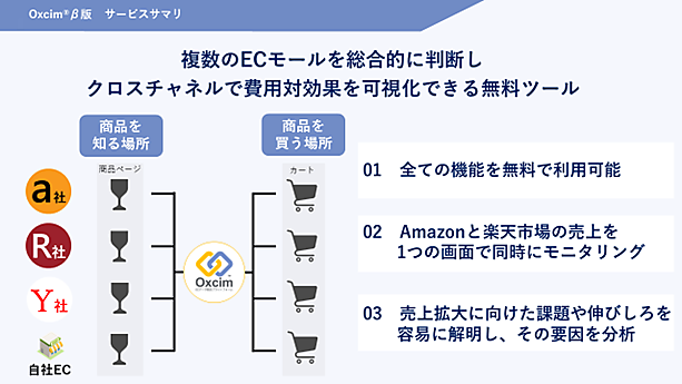 Oxcimはメーカー企業のECモール攻略を支援する無料のデータ統合プラットフォーム。実装済みの「Amazon」分析とあわせ、国内ECモールで1位と2位の市場規模のマーケット状況の分析やポジショニング、問題発見、売上要因の分析が1つの画面できる。22年度以内に「PayPayモール(旧Yahoo!ショッピング)」への対応も完了する予定だ。